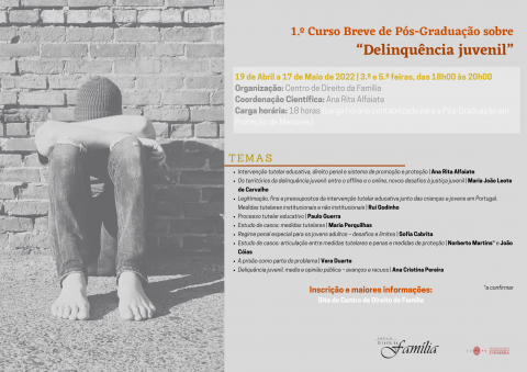 1.º Curso Breve de Pós-Graduação sobre “Delinquência juvenil”![]() Data: Terça, Abril 19, 2022 a Terça, Maio 17, 2022 Direcção Científica: Ana Rita Alfaiate |
