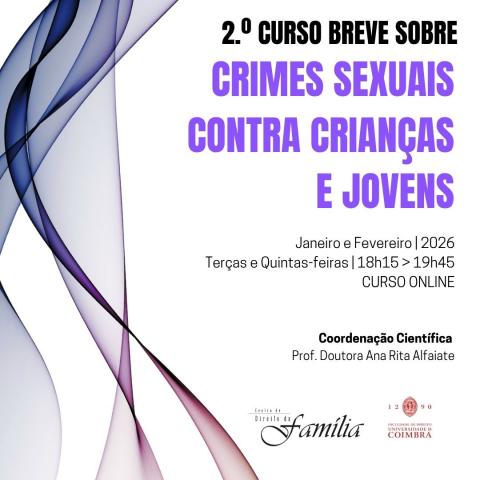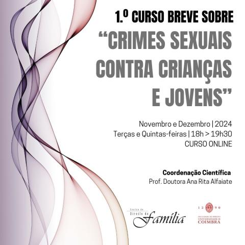 1.º Curso Breve sobre Crimes Sexuais contra Crianças e Jovens![]() Data: Terça, Novembro 19, 2024 a Quinta, Dezembro 12, 2024 Coordenação: Ana Rita Alfaiate |